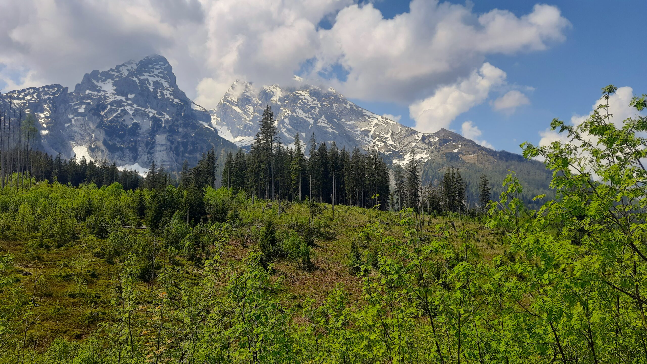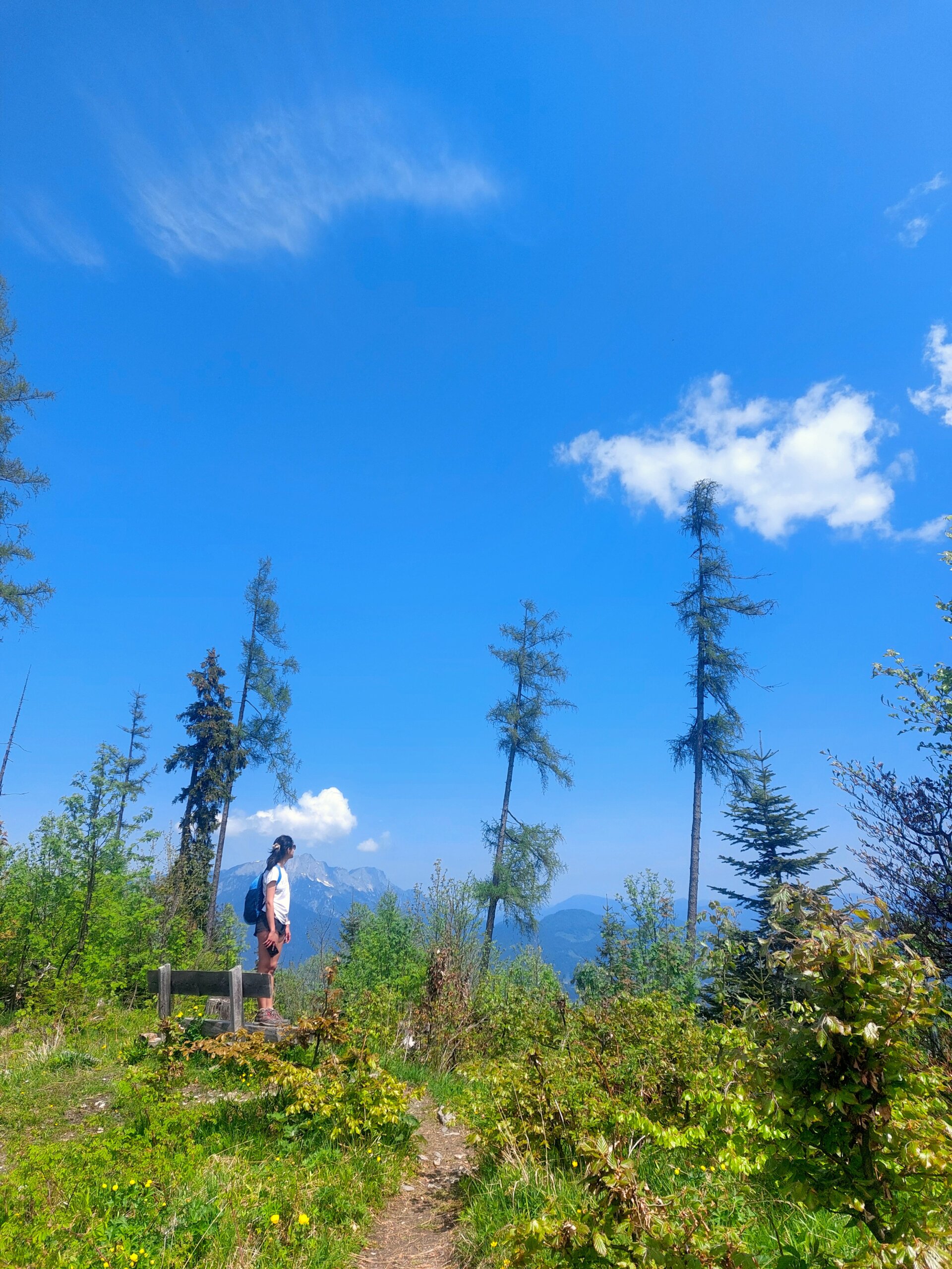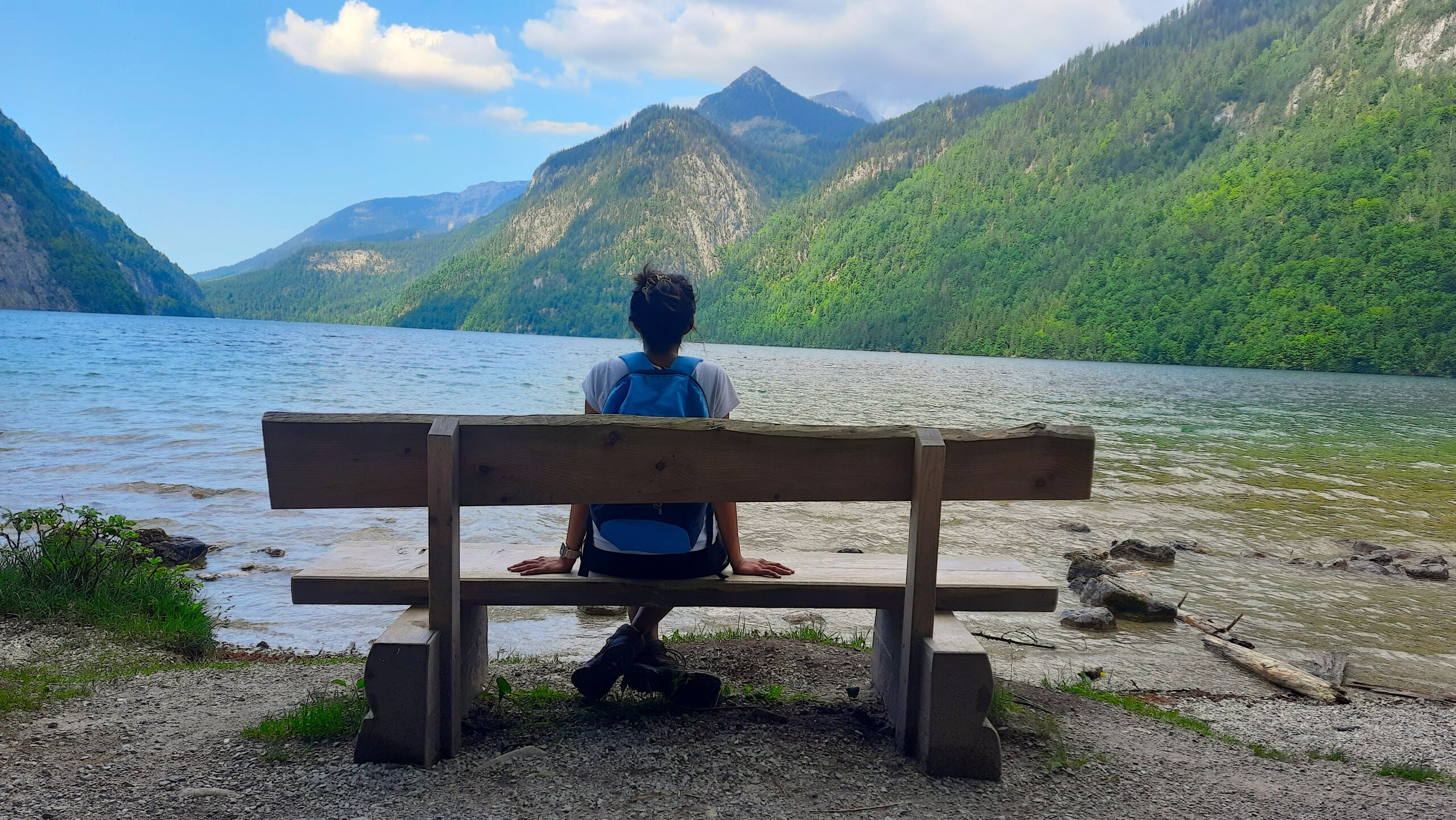 Hours after we started the hike, we were physically exhausted and eager to rest. The long and rocky trail led to eagerness to sight the lake, leaving us wearied. Right in that moment, we stumbled upon a wooden bench overlooking the highest peak of the Watzmann family. With swift decisiveness, we dropped our bags to the ground and sank onto the bench, savouring each deep breath, all the while marvelling at the ethereal beauty of the snow-kissed Alps all around. Each hike has its own little moments of bliss and this halt at an altitude of 1500m was certainly one, as each of us surrendered to the sounds of leaves rustling and birds chirping. And as the alpine flowers swayed in graceful rhythm with the winds, our hearts were full and dancing along to the symphony.