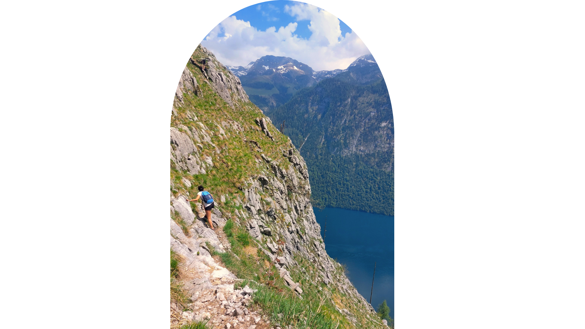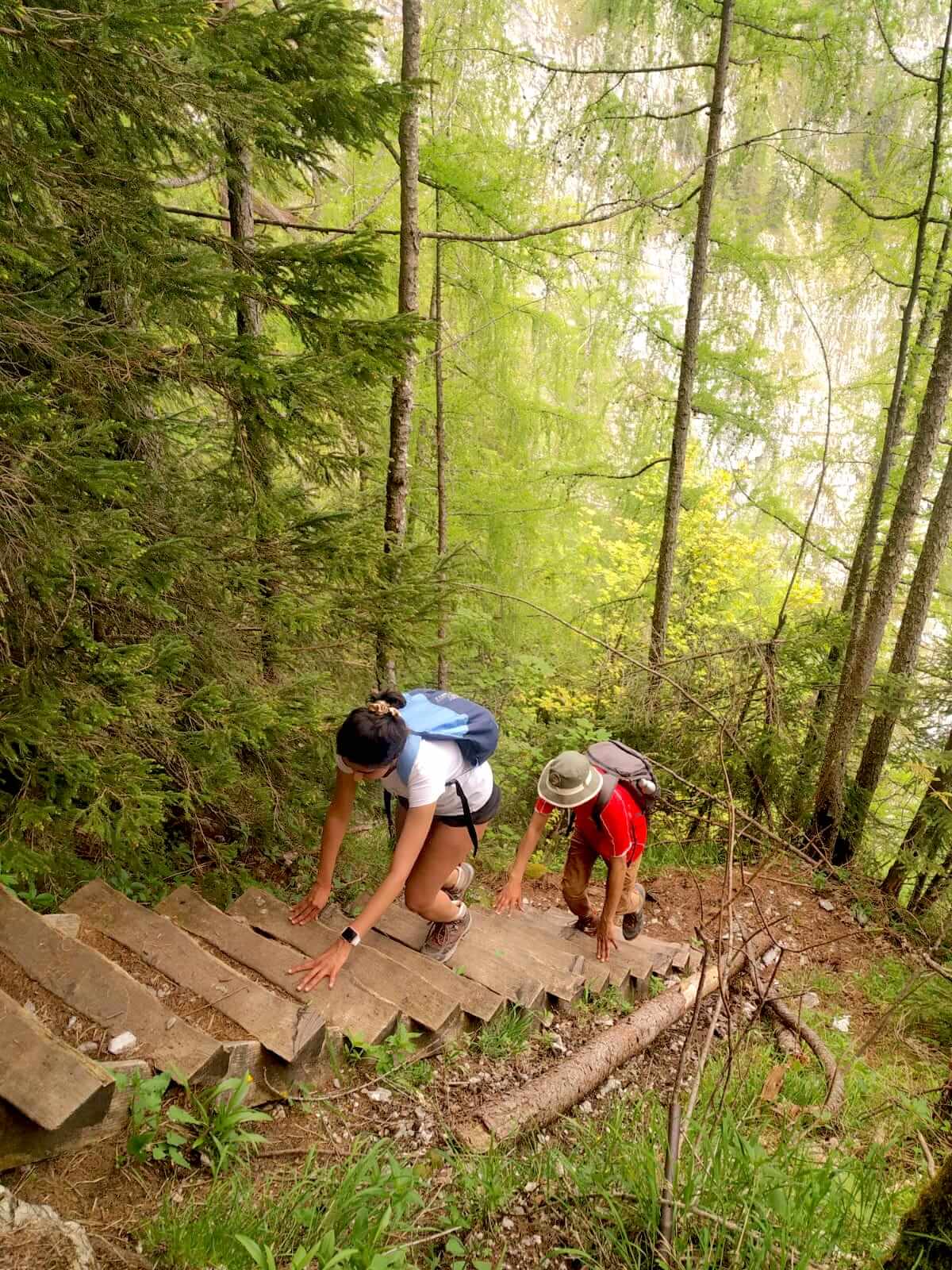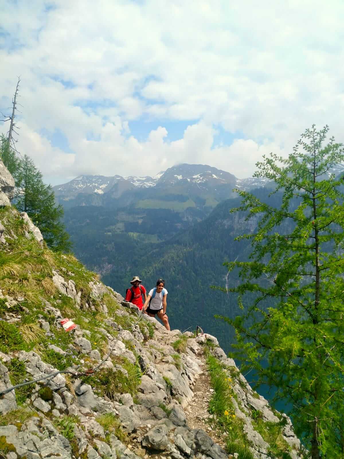 As we descended, the crimson red onion-domes of St. Bartholomä grew increasingly luminous. The soundless EV boats seemed like white ants on the move. With our gazes affixed to the enchanting beauty of Königssee, we steadily moved forward. At times, we held onto the steel cables anchored to the boulders while other moments found us descending on wooden logs secured to the steep rocks.