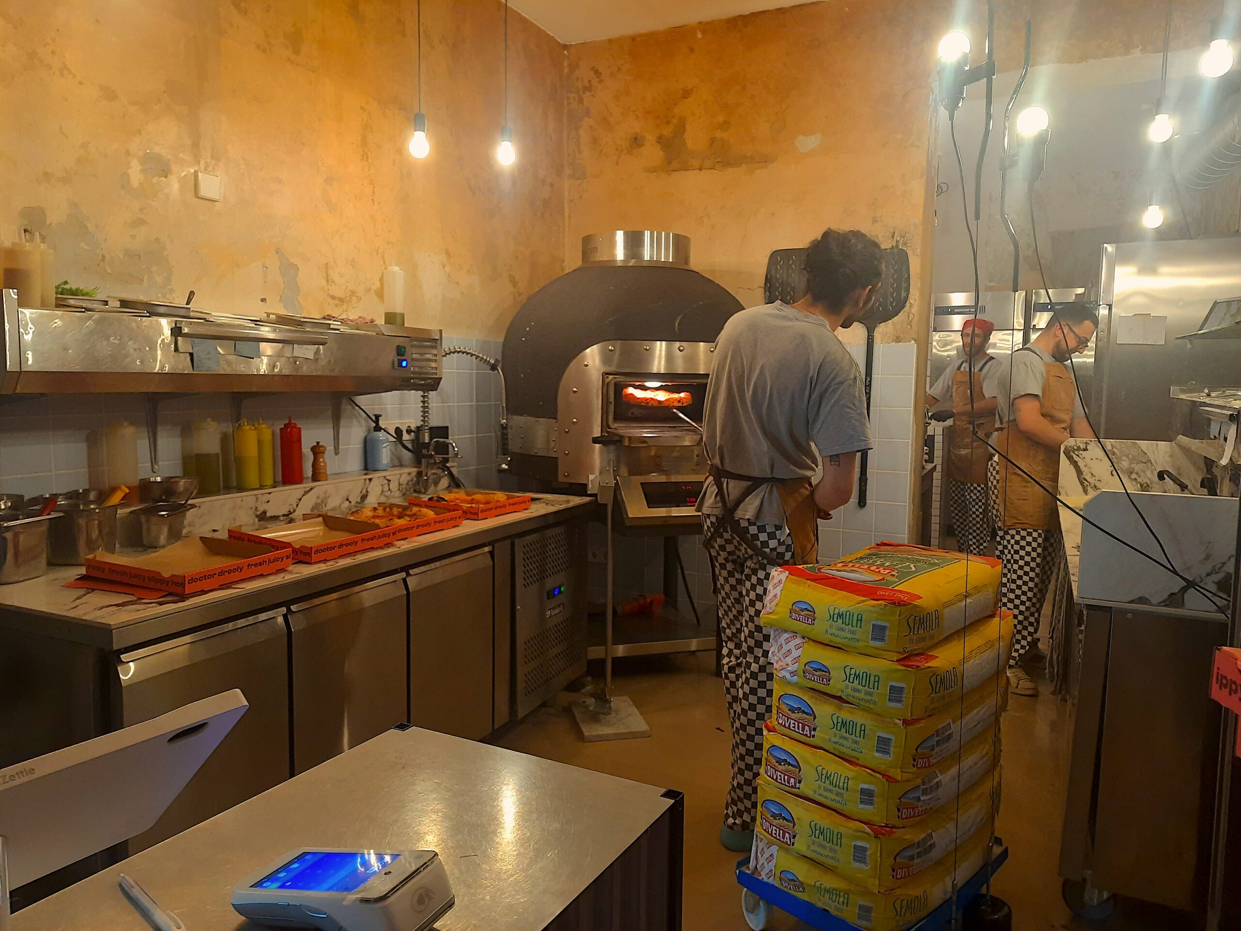 Back when we went in the summer of 2023, we sat outside in the corridor on a bench, but now it seems like they’ve got some seats in place for the chilly Munich winter. The best part? These pizza doctors are not just good at making pizzas; they’re friendly and happily dance around from the oven to the kitchen and back. It’s a joy to watch them love what they do in their second-hand staff clothing.